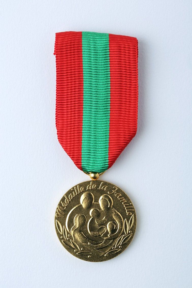 Alors d'abord, Oui, c'est bien une médaille avec son petit ruban ! Un ruban rouge et vert surmontant une médaille symbolisant la famille dont la forme n'a changé qu'une seule fois depuis 1920.
