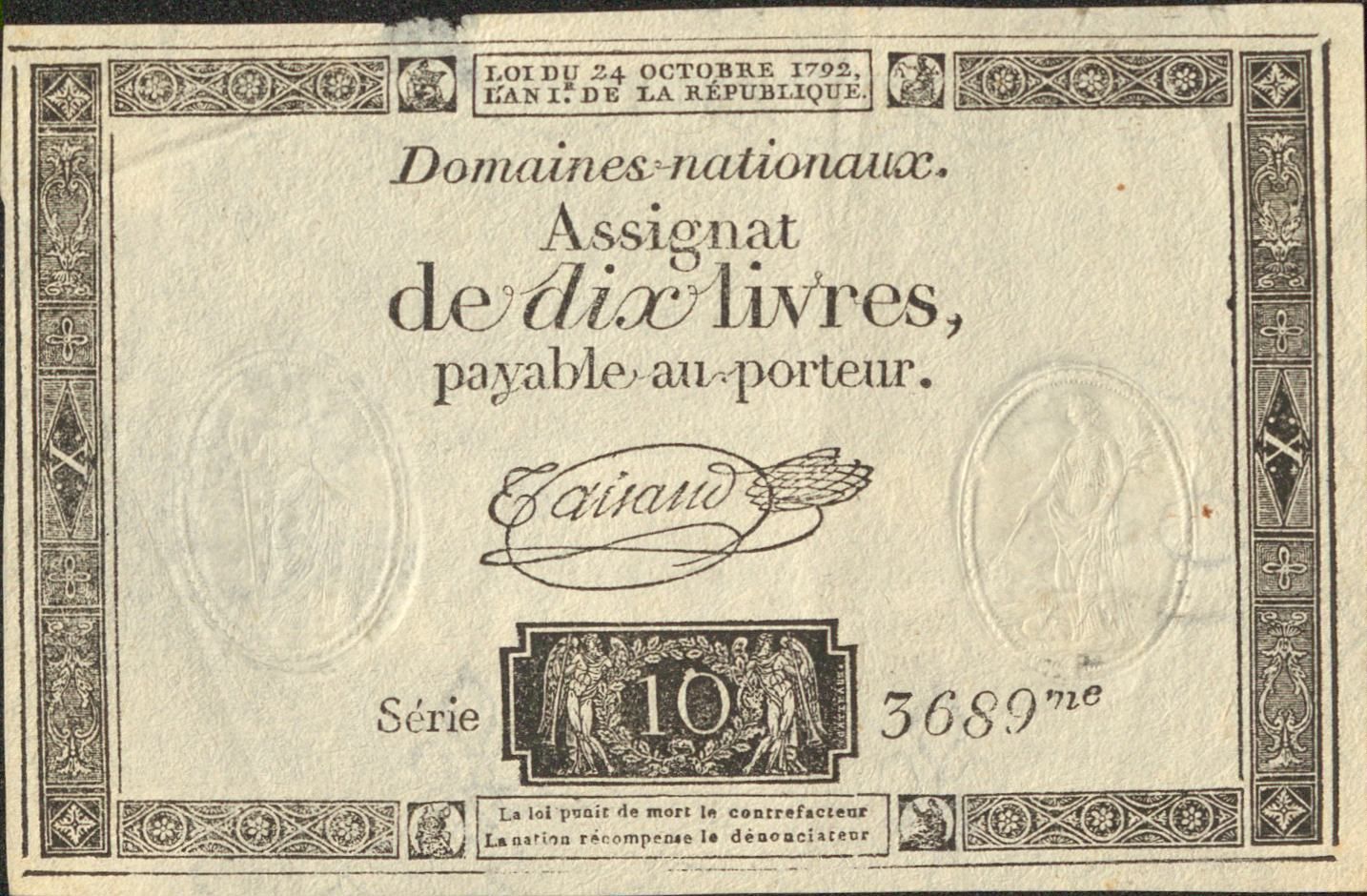 On notera sur ces assignats la mention « La loi punit de mort le contrefacteur / La Nation récompense le dénonciateur »