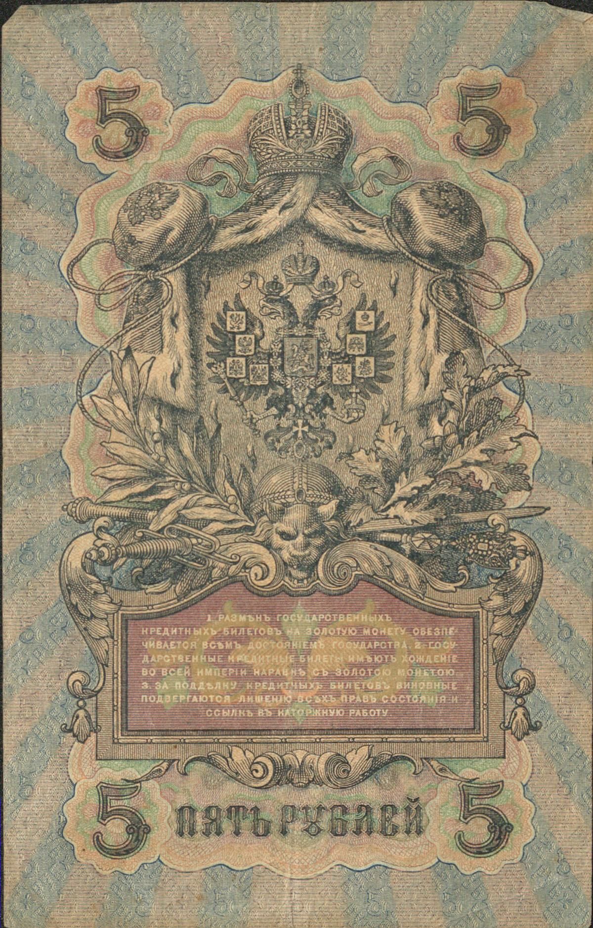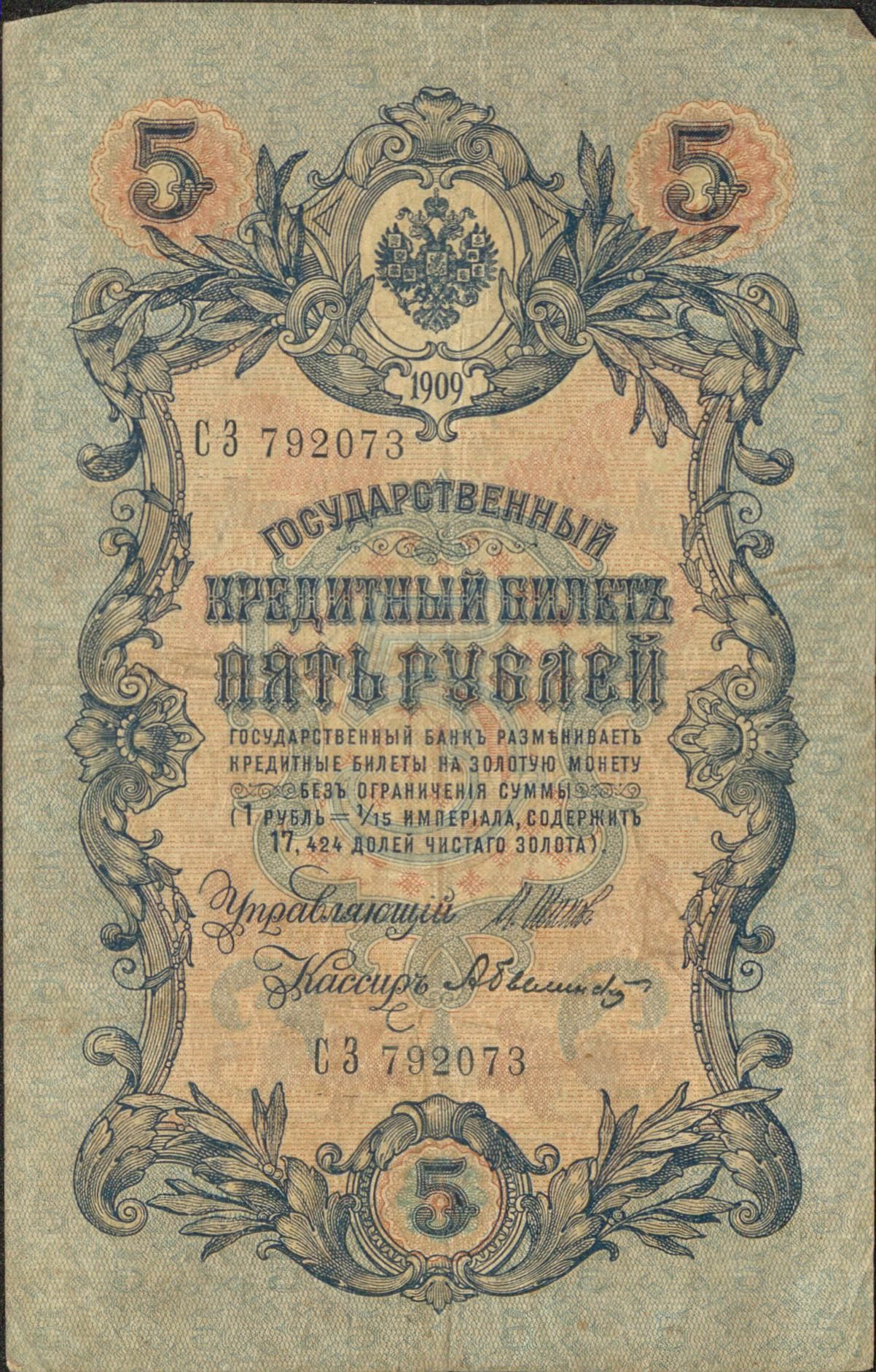 Nous avons là un billet de 3 roubles de 1905, un billet de 5 roubles de 1909 et un billet de 10 roubles de 1909 également