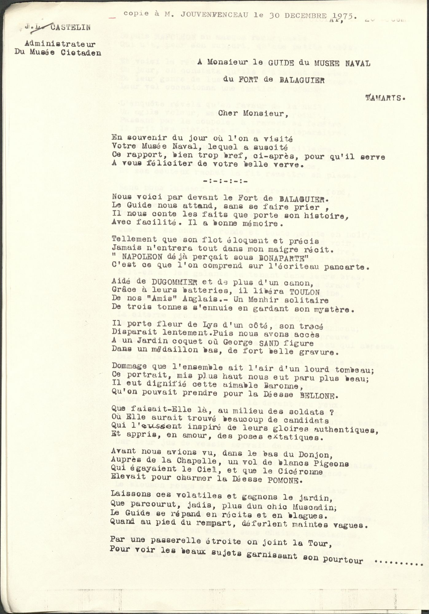 C’est à travers un poème en alexandrin à destination du guide du musée qu’il refait sa visite par le menu et exprime les émotions qu’il a ressenties.