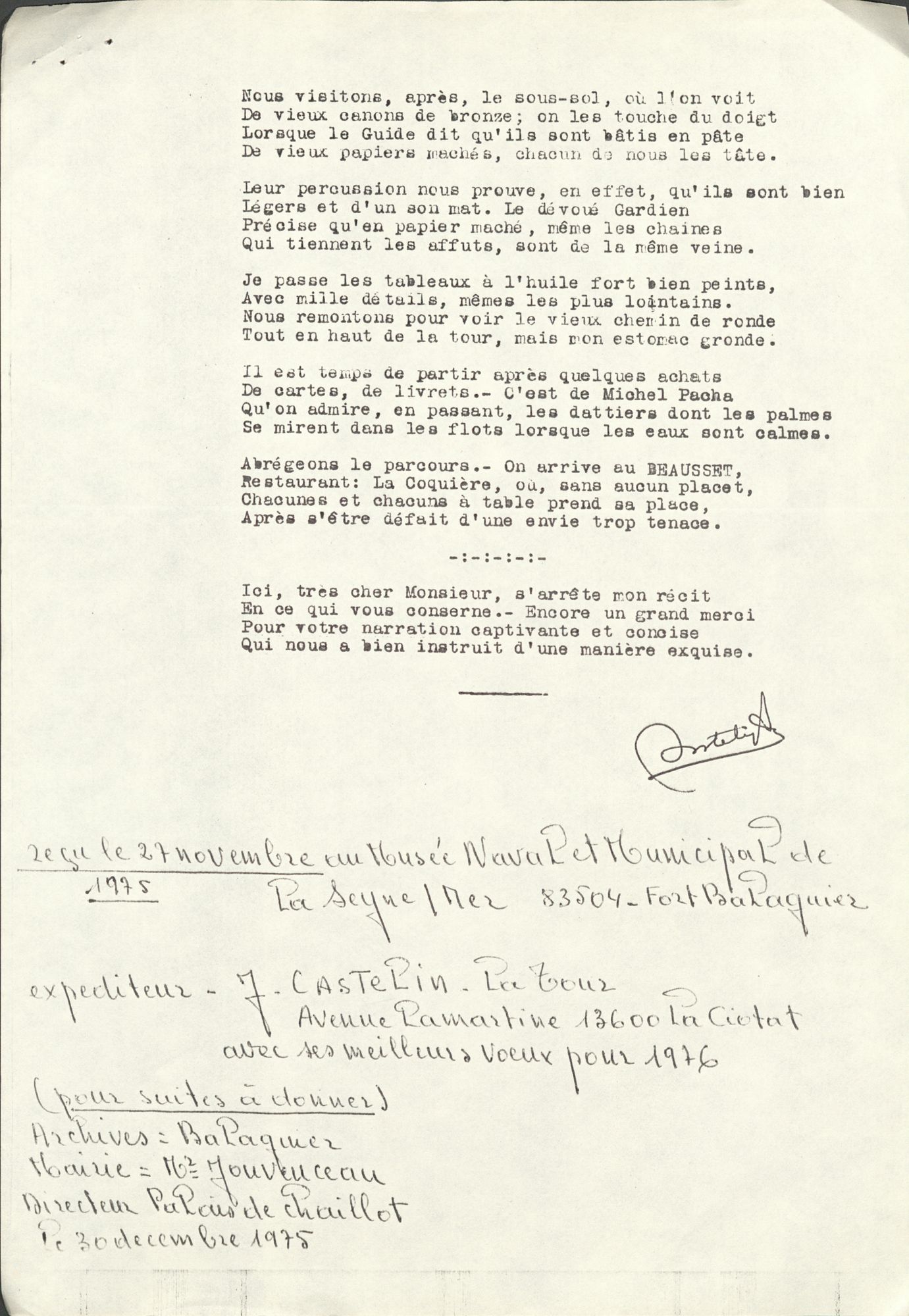 C’est en tout cas l'effet inattendu vécu par Monsieur Castellin lors d'une visite au musée Naval et Municipal du Fort Balaguier en 1975. Notre poète d'un jour est l’administrateur du musée Ciotaden, géré par Les Amis du Vieux La Ciotat depuis 1941, dans lequel on retrouve tout le patrimoine de la Ville, de l'invention du cinématographe aux anciens chantiers navals.