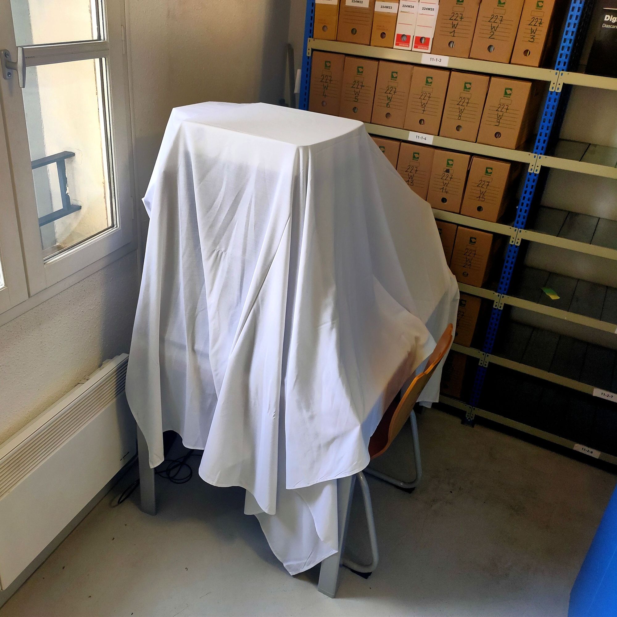 Ah mais oui, ce qu'on entend sous ce drap, ce n'est rien moins que le doux bruit de la caméra haute résolution qui balaye le registre. À la poursuite des projecteurs d'exposition, elle capture en haute définition la mémoire et l'histoire.