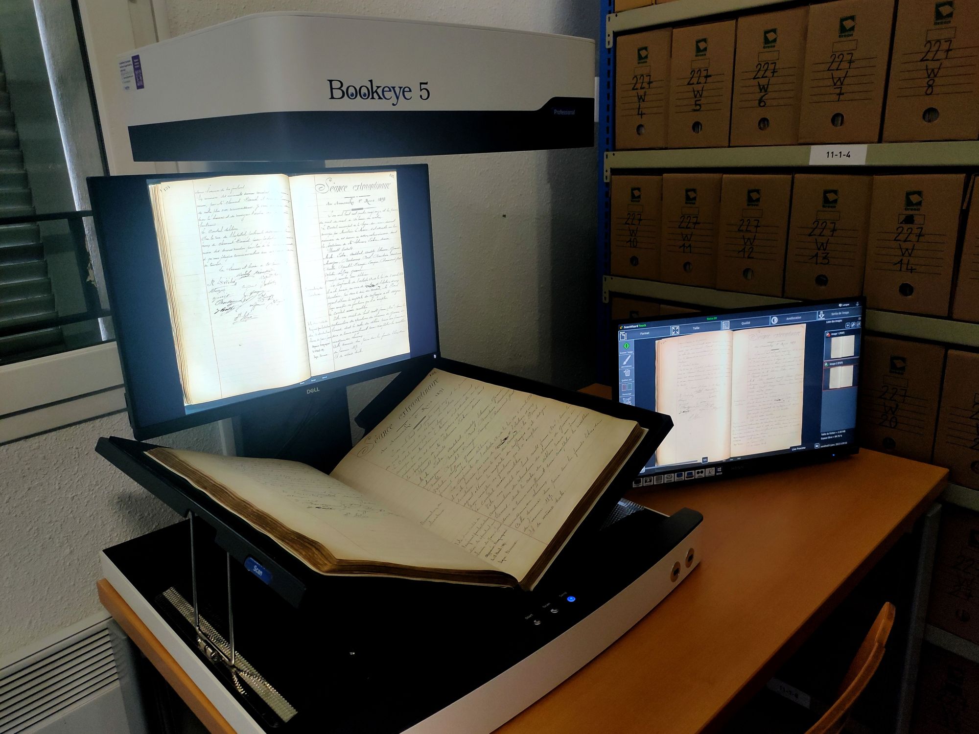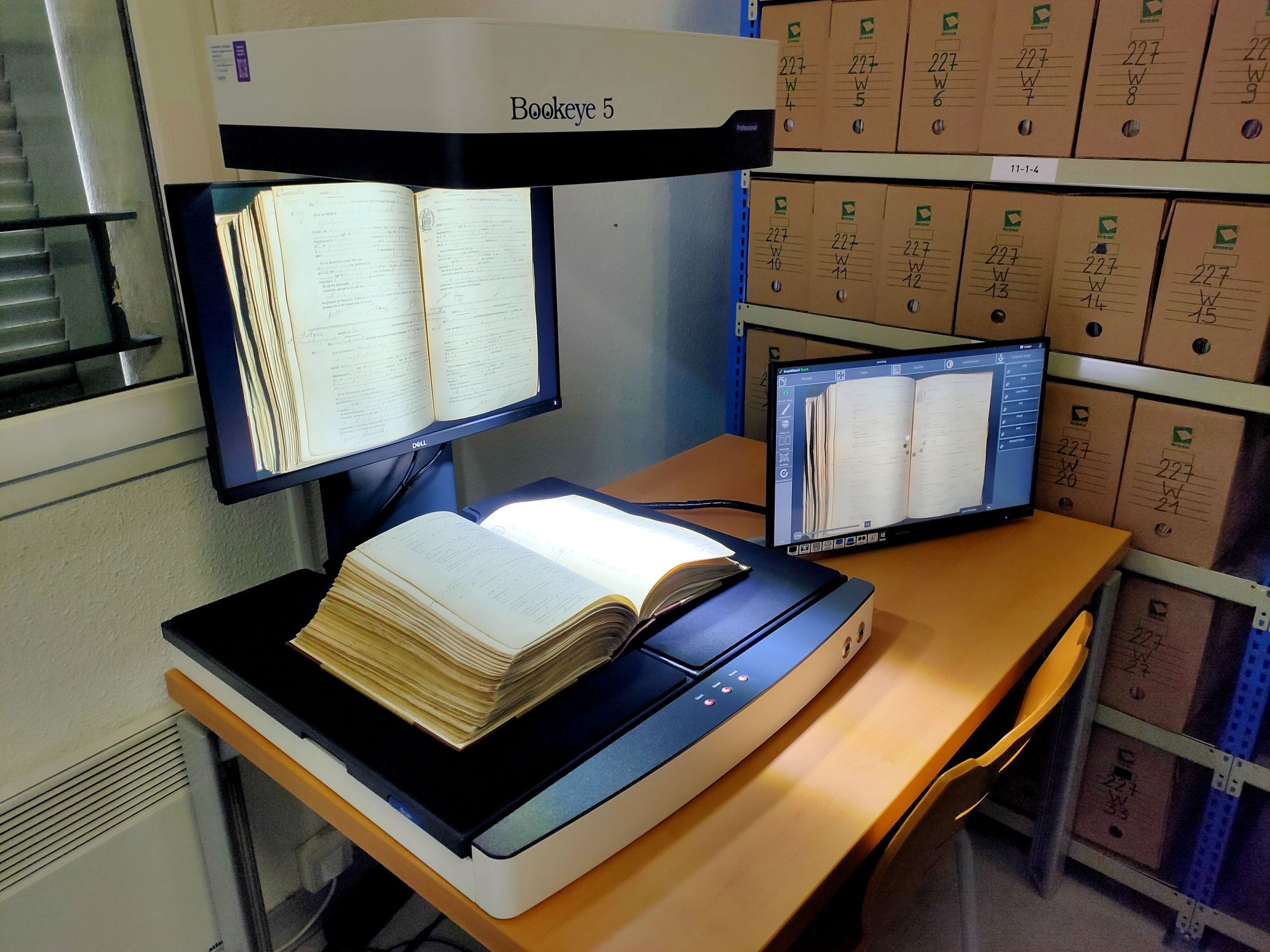 Vous avez devant vous un scanner Bookeye 5 V2. Il s'agit d'un scanner de registre professionnel dont la particularité est de numériser les documents directement par le haut grâce à sa caméra. Avec ce système, le service peut enfin envisager de numériser ses nombreux registres pour...les mettre sur son site internet, par exemple ! 😁