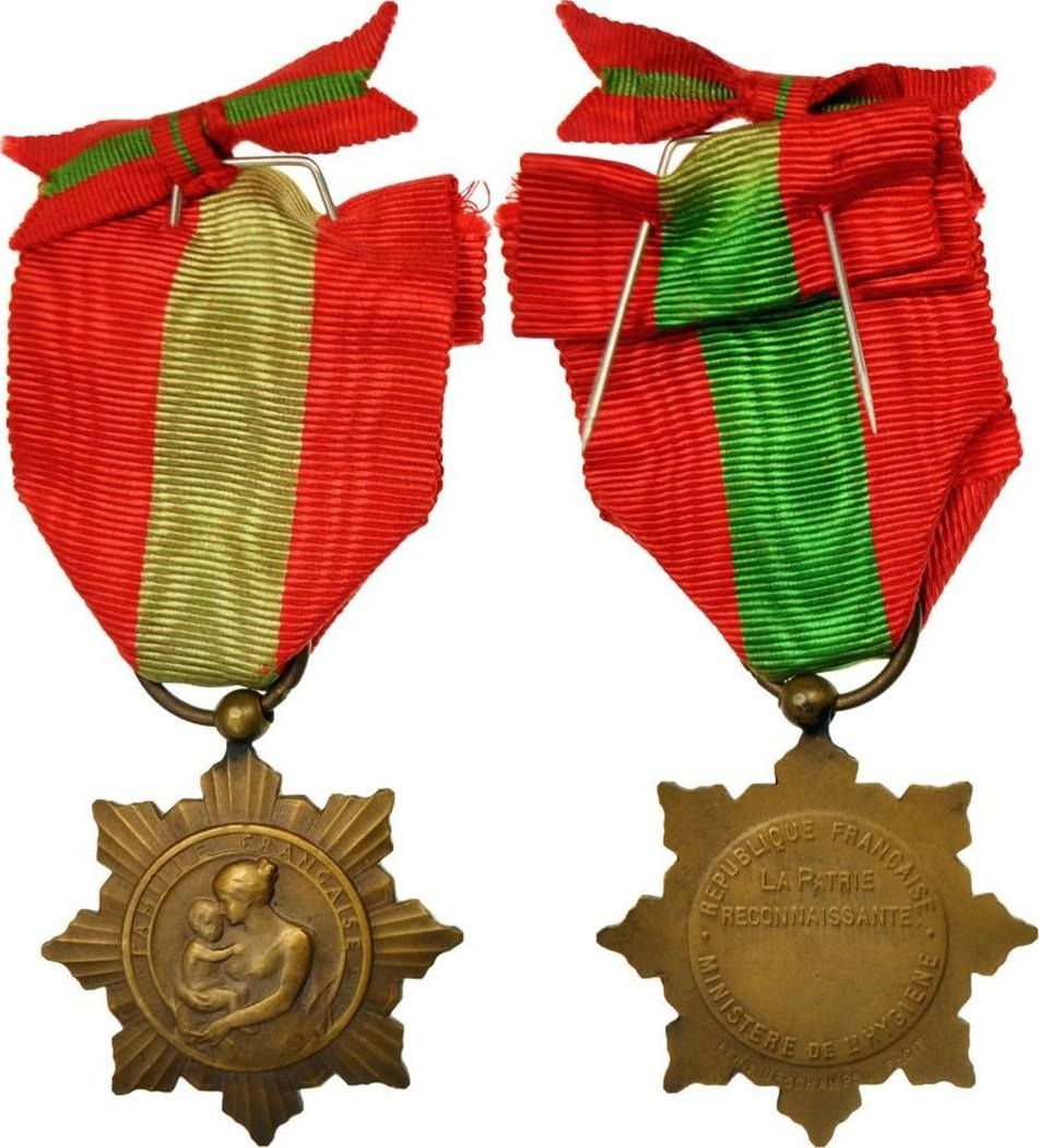 Alors d'abord, Oui, c'est bien une médaille avec son petit ruban ! Un ruban rouge et vert surmontant une médaille symbolisant la famille dont la forme n'a changé qu'une seule fois depuis 1920.