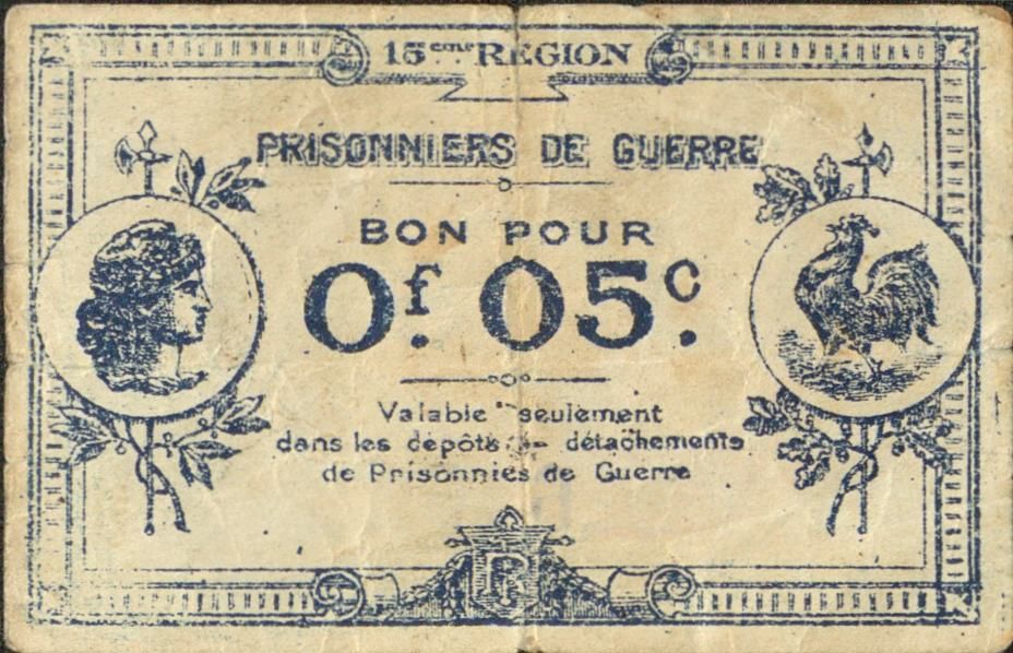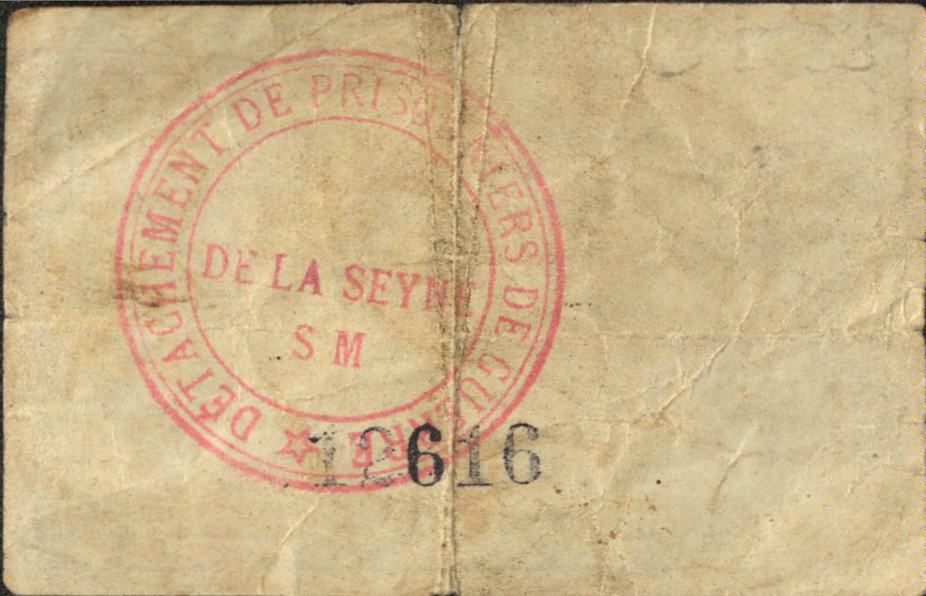 C'est le cas ici pour ce bon de 5 centimes valable uniquement dans les dépôts et détachements de Prisonniers de Guerre. Plus précisément, il concerne le détachement de prisonniers de guerre de la Seyne-sur-Mer qui fournit à ses « pensionnaires » allemands cette petite monnaie locale en papier pour répondre à leurs besoins.