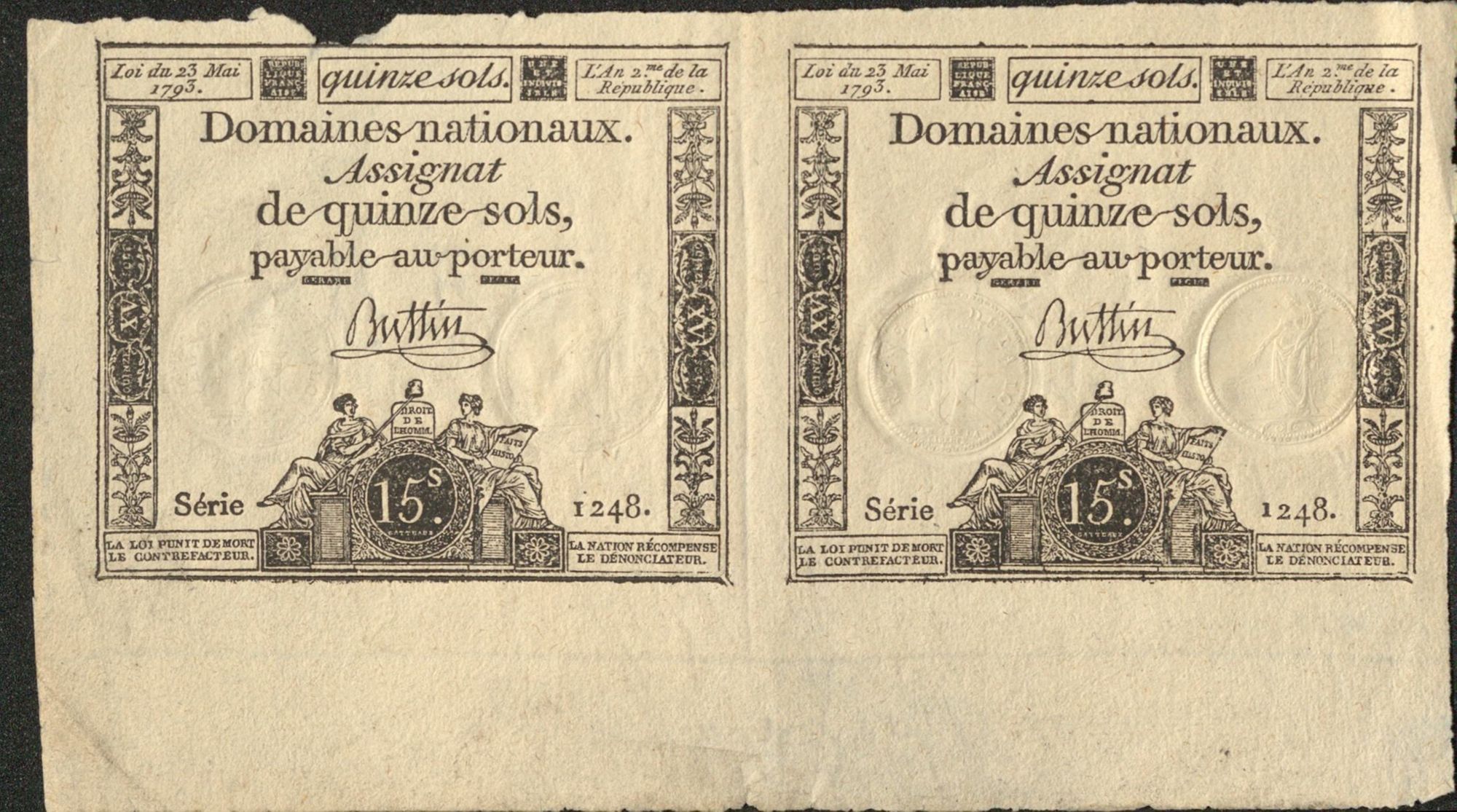 On notera sur ces assignats la mention « La loi punit de mort le contrefacteur / La Nation récompense le dénonciateur »