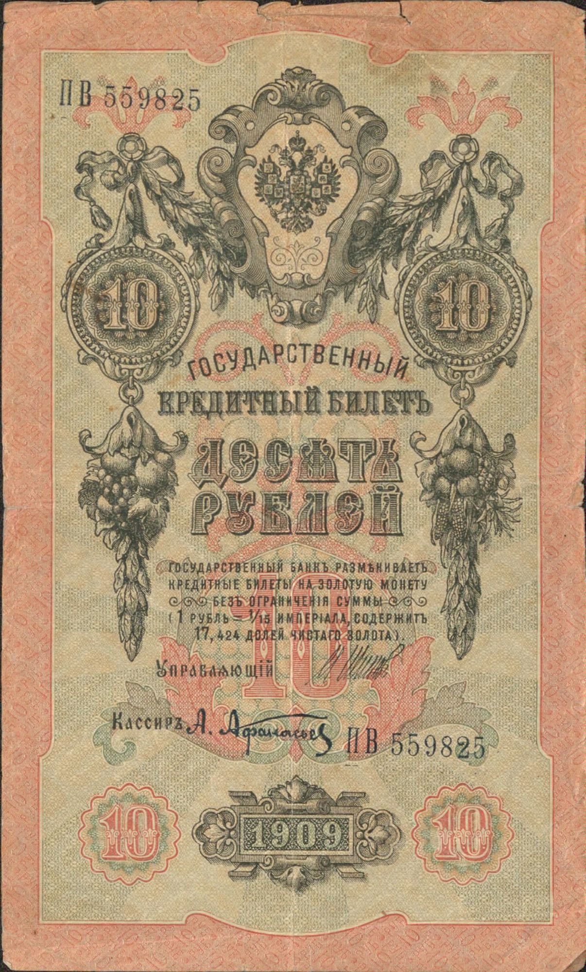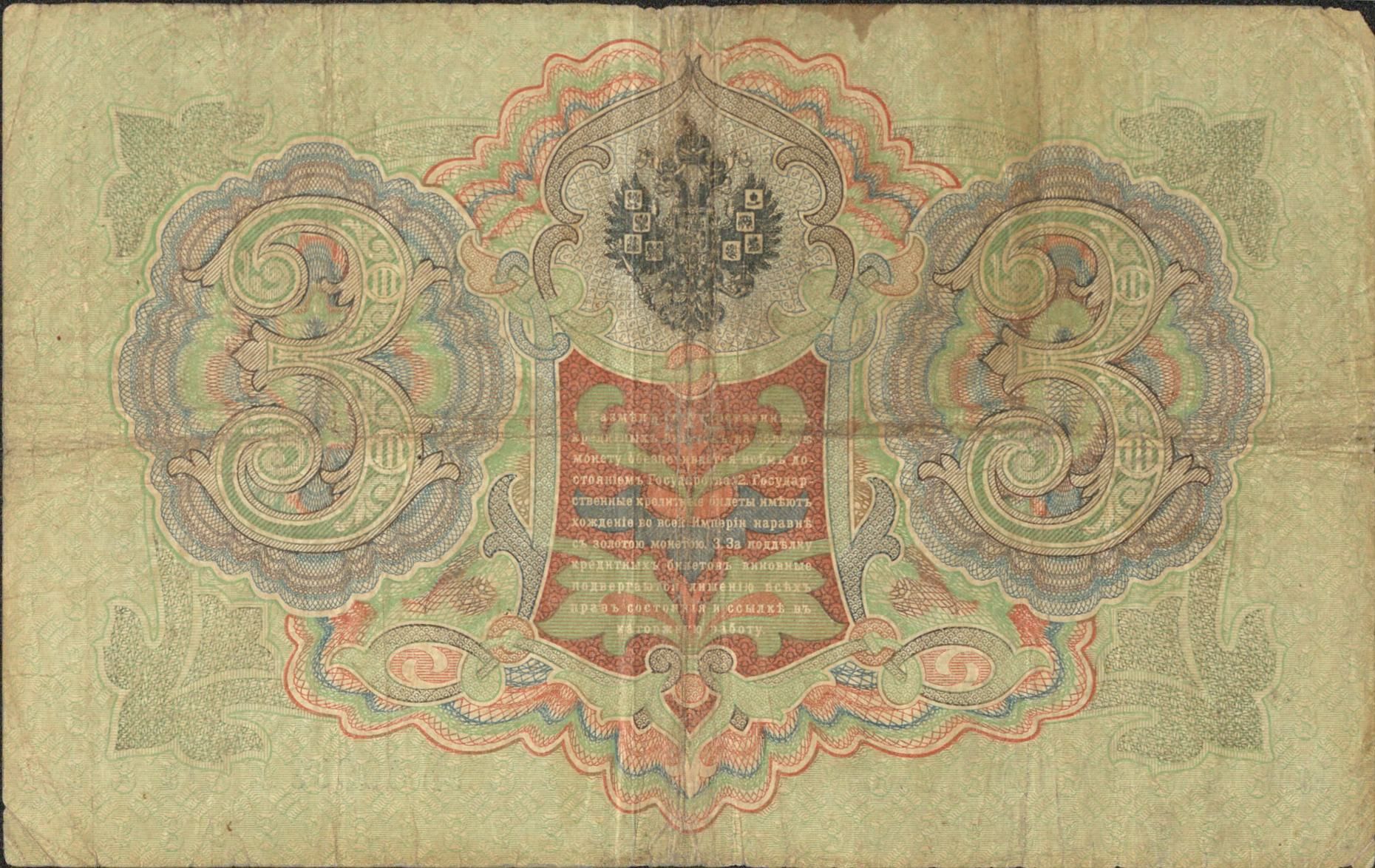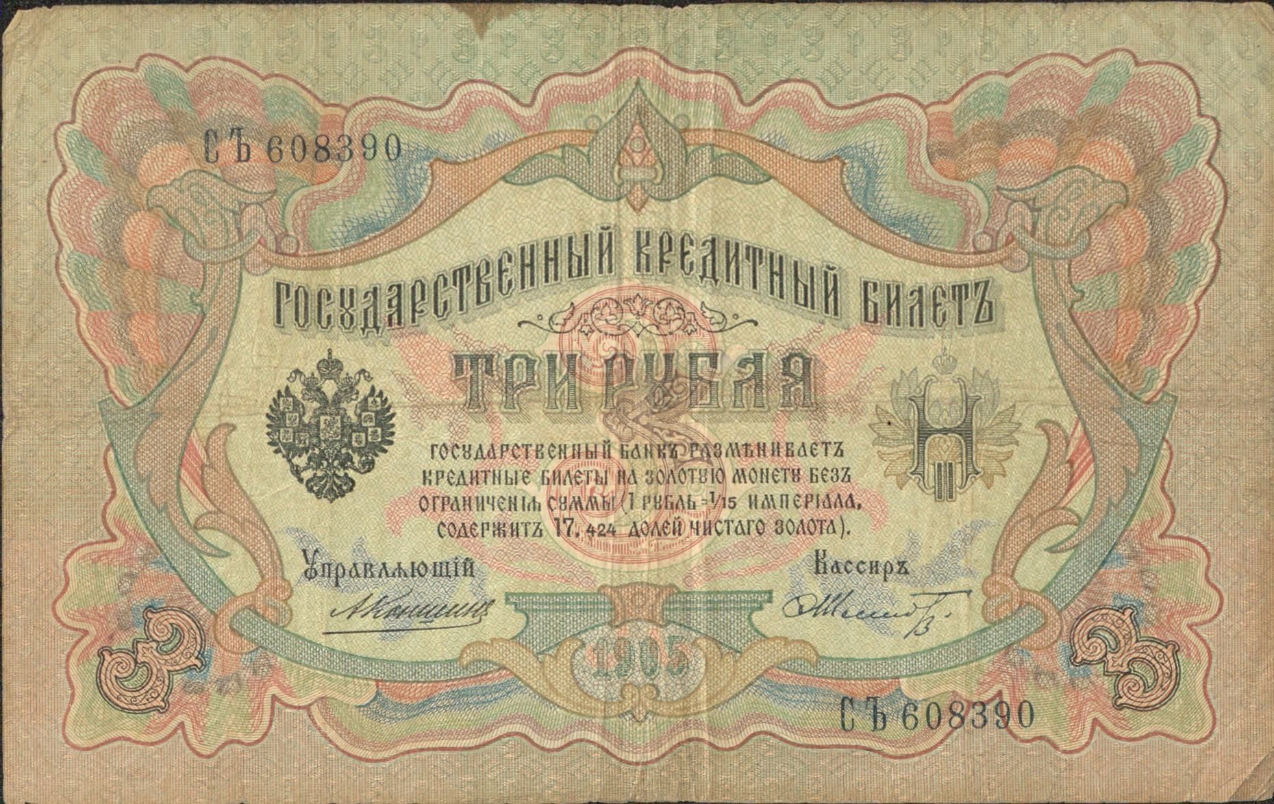 Nous avons là un billet de 3 roubles de 1905, un billet de 5 roubles de 1909 et un billet de 10 roubles de 1909 également