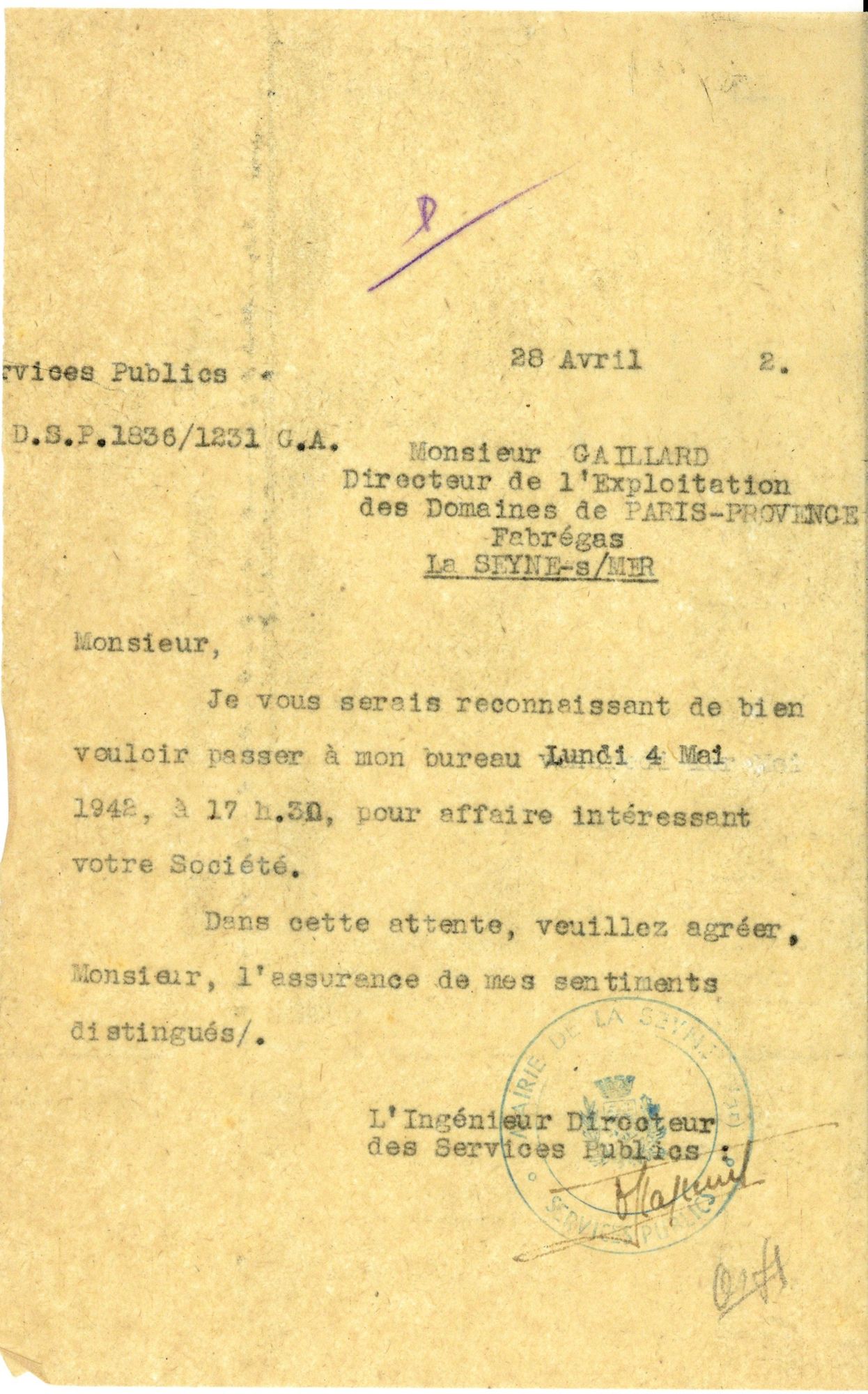 Il s'agit de la parcelle de la société immobilière Paris-Provence, celui qui deviendra plus tard le domaine de Fabrégas. La Ville invite son directeur d'exploitation, monsieur Pol Gaillard, à se rendre en Mairie pour discuter de l'affaire. Et c'est à ce moment que tout dérape. Les services techniques ont la surprise de voir venir au rendez-vous....sa femme. Monsieur Gaillard est à Paris....en zone occupée. 😟