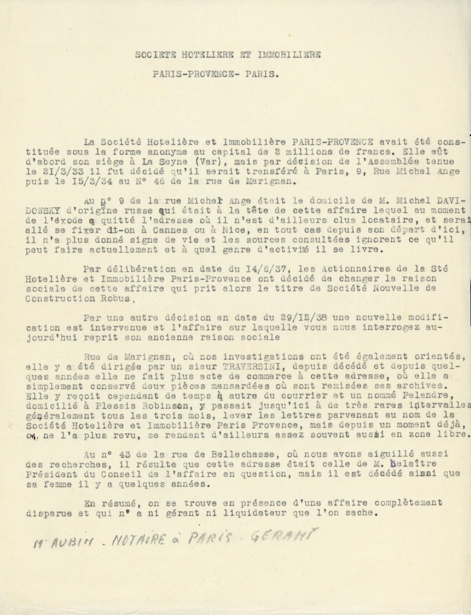 La note de renseignements montre les démarches entreprises pour retrouver les propriétaires, allant de domicile en domicile, mais trouvant chaque fois porte close. Surtout elle montre en filigrane plusieurs choses. D'abord, la désorganisation causée par le fait de guerre. L'occupation allemande complique grandement les démarches et les contacts. Elle pousse également à l'exil certaines populations ou ressortissants, comme ce Michel Davidowsky, d'origine Russe, qui serait parti dans le Sud de la France sans plus donner de nouvelles. Enfin, elle montre l'état catatonique d'une partie de l'économie, avec des gérants qui disparaissent ou qui meurent sans que les affaires ne soient reprises.