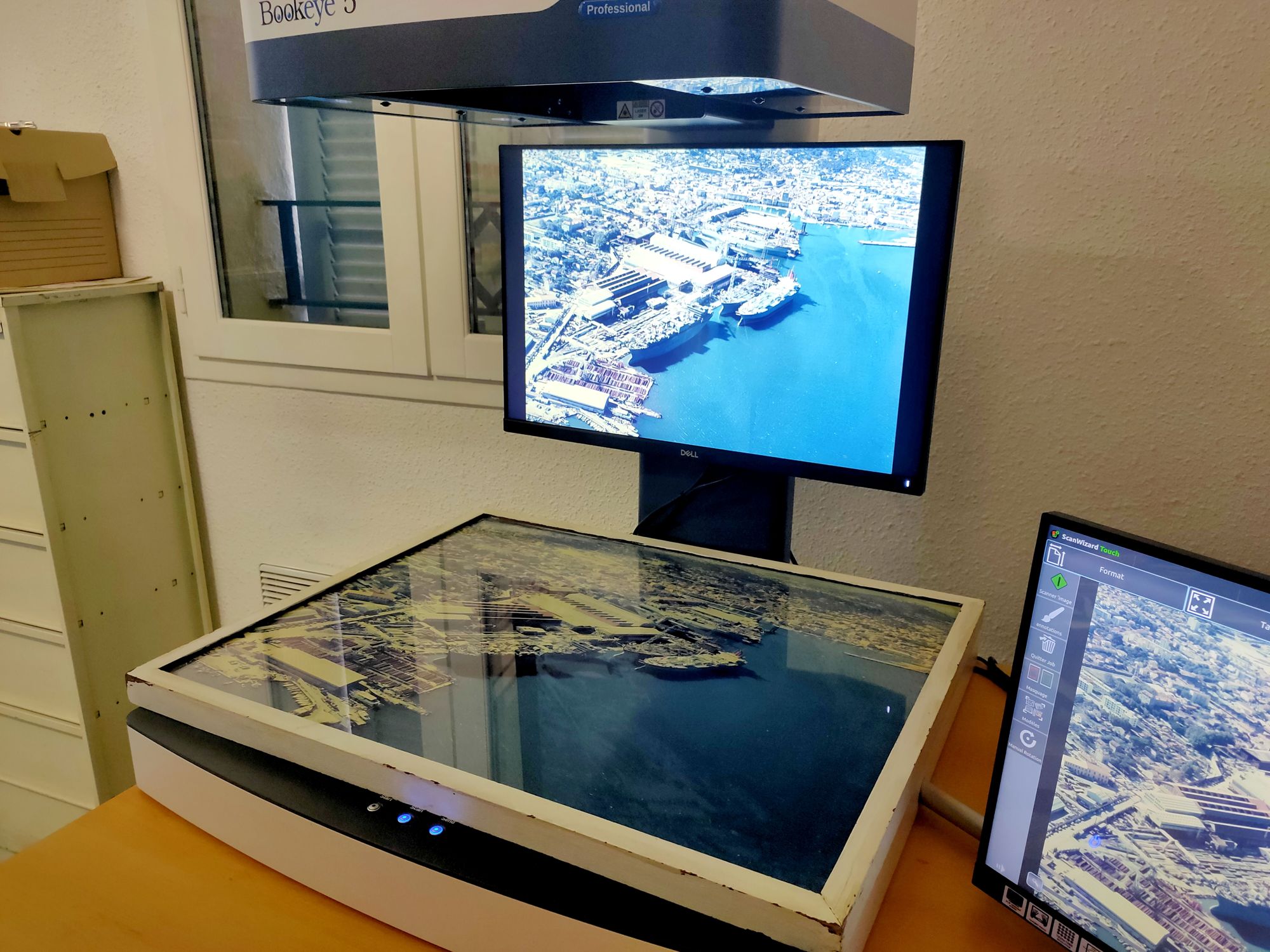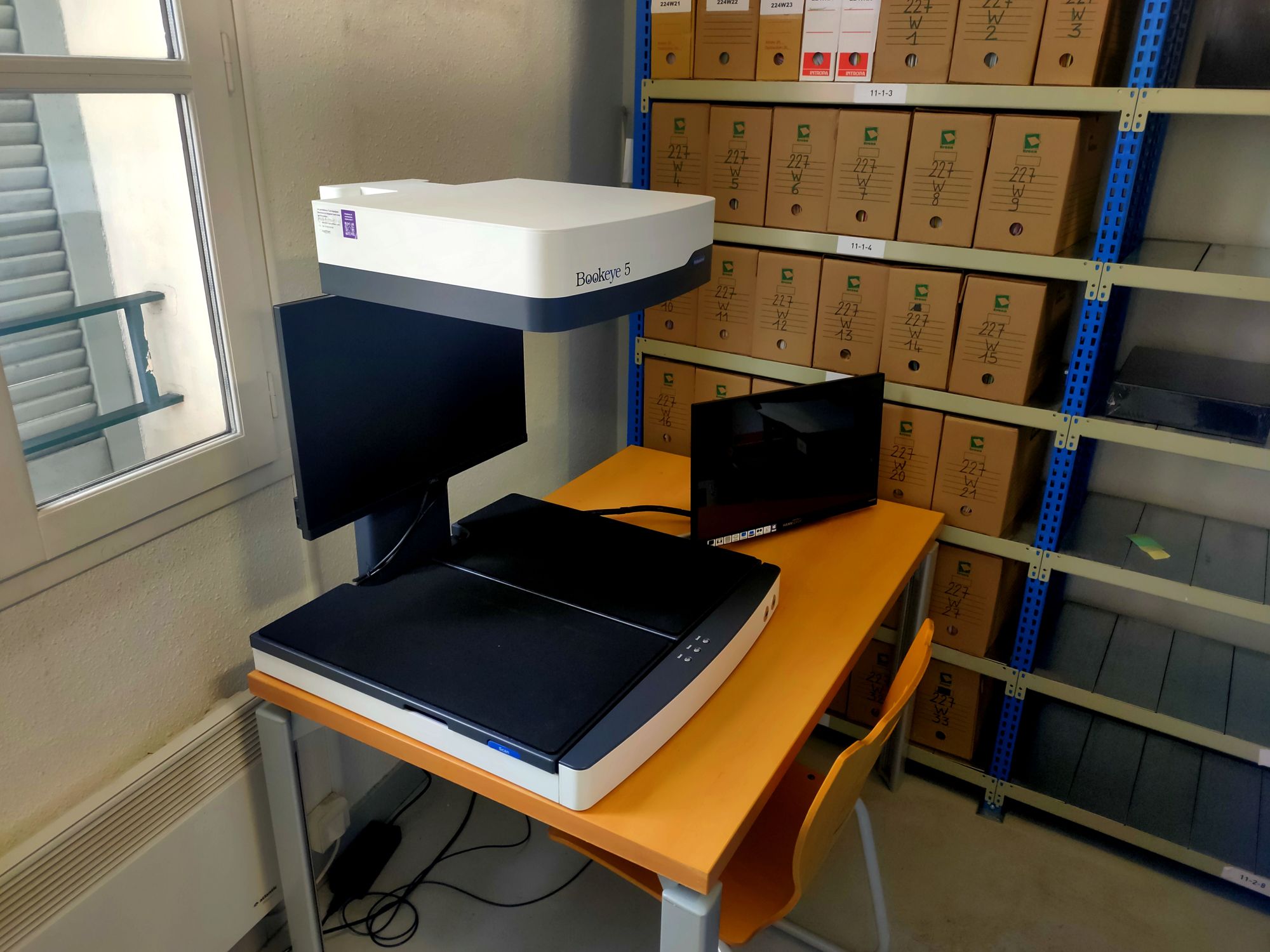Vous avez devant vous un scanner Bookeye 5 V2. Il s'agit d'un scanner de registre professionnel dont la particularité est de numériser les documents directement par le haut grâce à sa caméra. Avec ce système, le service peut enfin envisager de numériser ses nombreux registres pour...les mettre sur son site internet, par exemple ! 😁